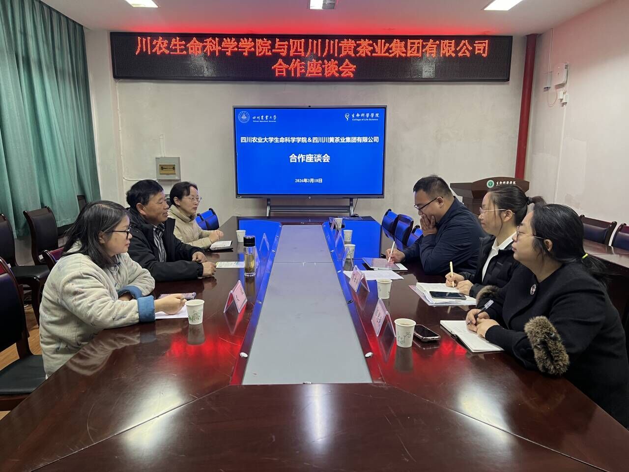 3月19日,学院与四川川黄茶业集团有限公司,在12教104会议室举行校企合作座谈会。川黄茶业集团董事长张大富、常务副总胡荣玉、副总文波,生科院副院长刘贺贺,行政办副主任鄢思利,植物生物学系袁明教授、冯士令副教授等相关领域教师出席会议。
