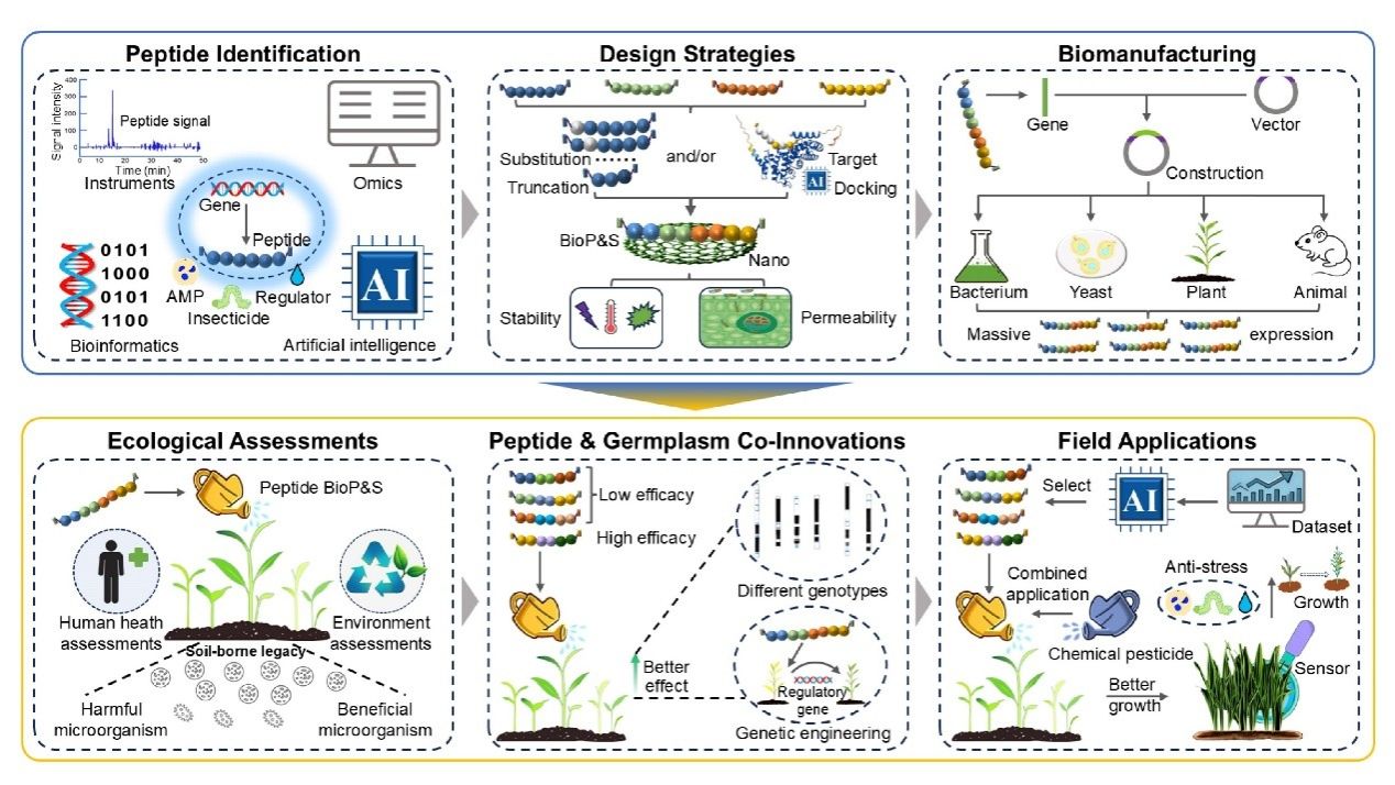 植物小肽凭借其多效性、高效性、可生物降解及低生态风险等优势,已成为替代传统化学农药的理想候选。然而,其产业化进程仍需突破两大核心瓶颈:一方面,从活性分子挖掘到机制解析、分子优化、生态评估乃至田间应用,需投入大量时间与资金,亟需建立高效系统的鉴定体系,以实现具有自主知识产权的活性小肽的精准发现;另一方面,农业投入品必须符合产业经济性要求,需针对特定小肽序列,优化底盘细胞、构建高效表达系统,并开发符合法规要求的生产工艺与纯化技术,最终集成完整的生物制造平台。目前,小肽高产率表达机制尚不明确,植物功能小肽的大规模系统鉴定及其在多底盘细胞中的高效适配仍是实现技术突破的关键路径。展望未来,人工智能、纳米技术及合成生物学等前沿技术的融合,将显著推动植物小肽的高效挖掘、理性设计、规模化生产与精准递送。通过多技术协同与政策支持,构建兼顾经济可行性与生态可持续性的应用模式,有望实现作物安全生产与生态环境保护的协同发展。